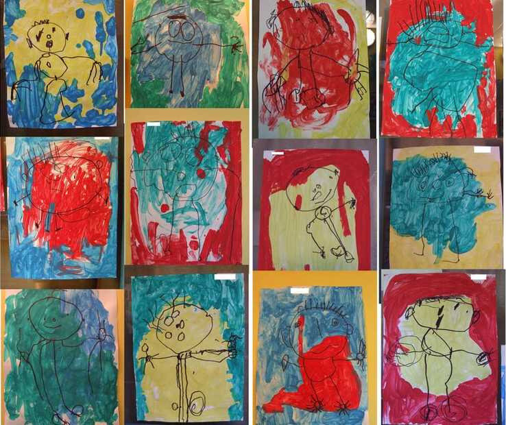 La peinture est souvent la grande gagnante pour servir de fond aux bonhommes qui, eux, ont été découpés dans les feuilles de dessin. Ici, sous forme de pantins :